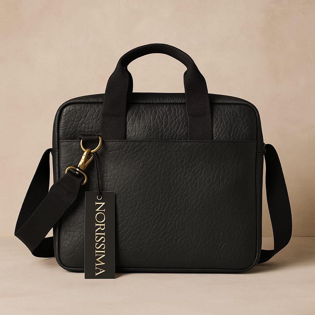 Bolso tipo maletín en cuero auténtico, tintada en color negro, con correas.