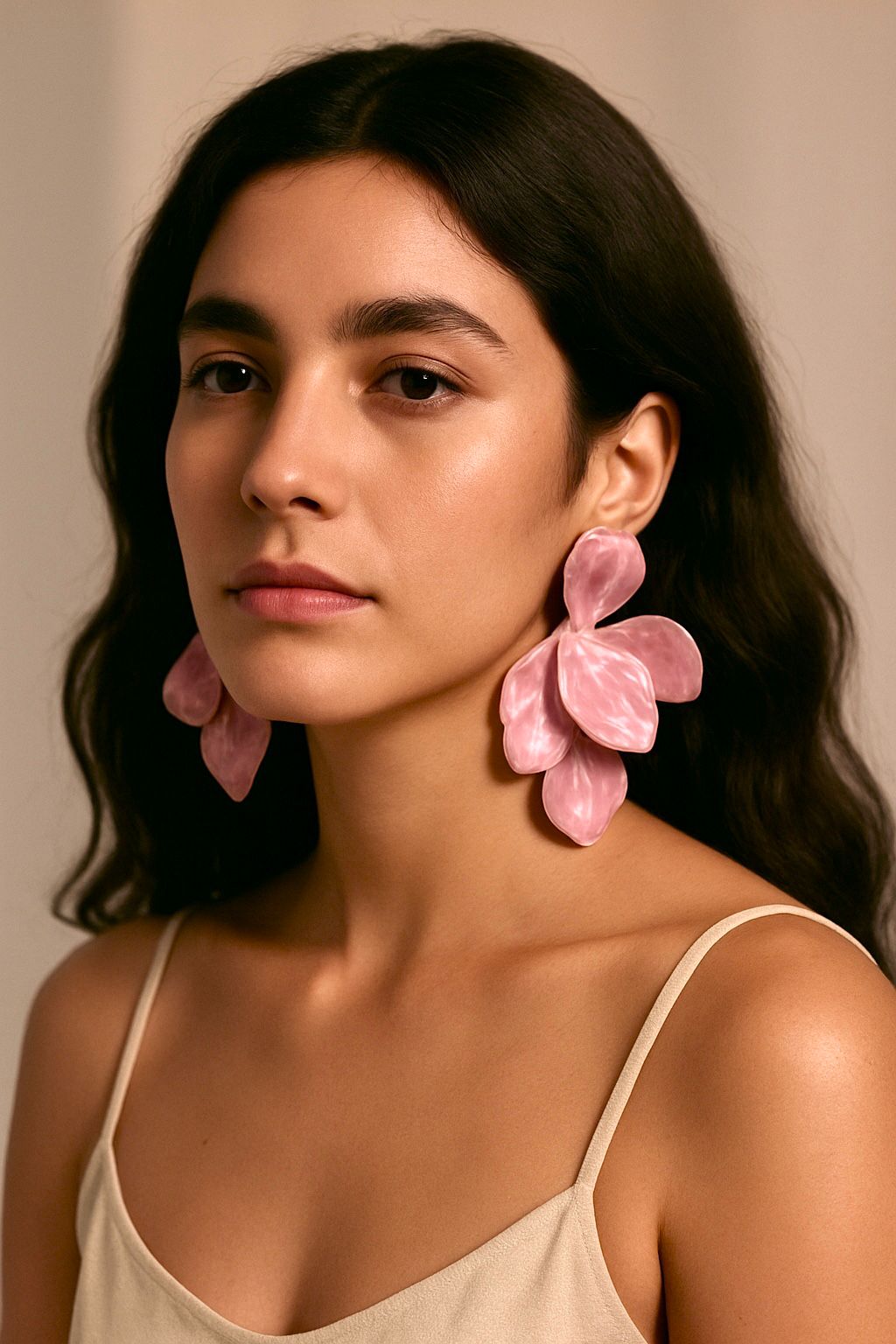 Par de aretes con forma de pétalos en color rosa, brillantes.